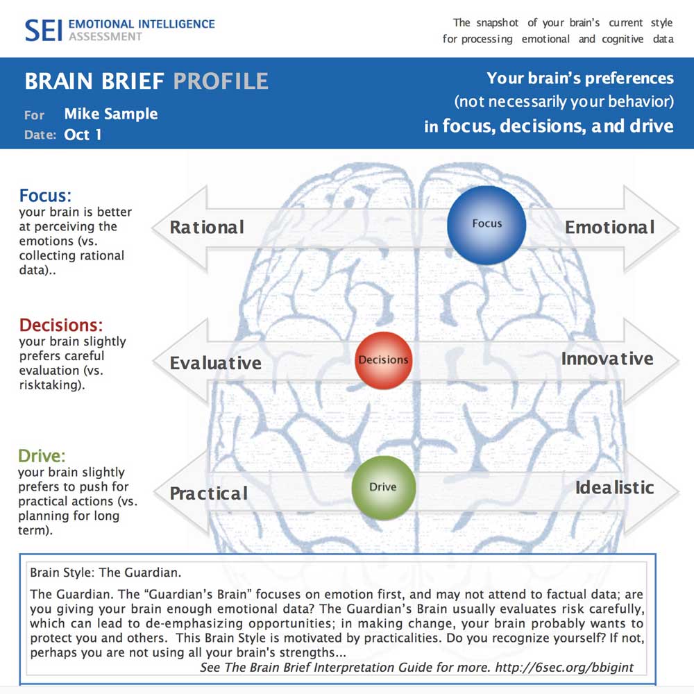 严肃的科学使事情变得简单。与许多“风格清单”不同,“大脑简介”是从全面的心理测量评估中提炼出来的。参与者参加SEI,这是班上最好的情绪智力评估。使用一种特殊算法分析响应,该算法利用所有20个标准量表。